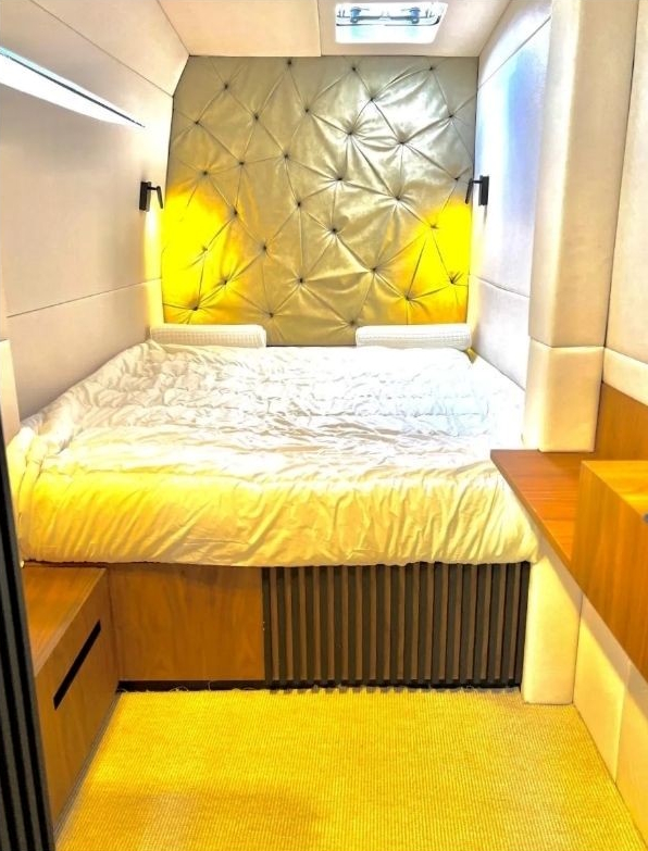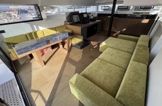 Prednja kabina ima prostrani ležaj za dvije osobe s visećim i velikim bočnim ormarima. Salon je opremljen prostranom klupom koja se prostire oko stola kojeg je moguće spustiti na razinu klupe i kreirati 2 dodatna ležaja za spavanje. Kuhinja se nalazi odmah ispred klupe salona tako da je kod pripreme hrane jednostavan pristup stolu za posluživanje.