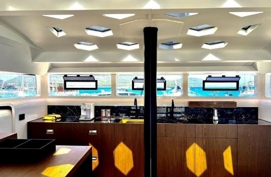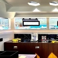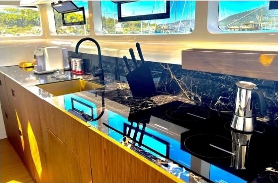 Kuhinja sadrži sve potrebno kao što su hladnjak, kuhalo na 220 V, sudoper s toplom i hladnom vodom, po želji mikrovalnom pećnicom i perilicom suđa te dosta spremišnog prostora za spremanje namirnica, pribora za jelo i ostalih potrebnih stvari… Dvije Kabine za goste su u stražnjem dijelu broda s 2 odvojena kreveta i zasebnim ulaznim vratima u kabine. U kupaonicu s odvojenim tušem se ulazi iz salona tako da ga nesmetano mogu koristiti svi gosti na brodu.