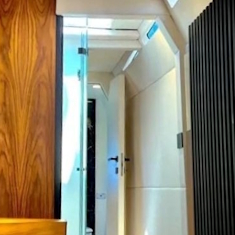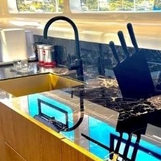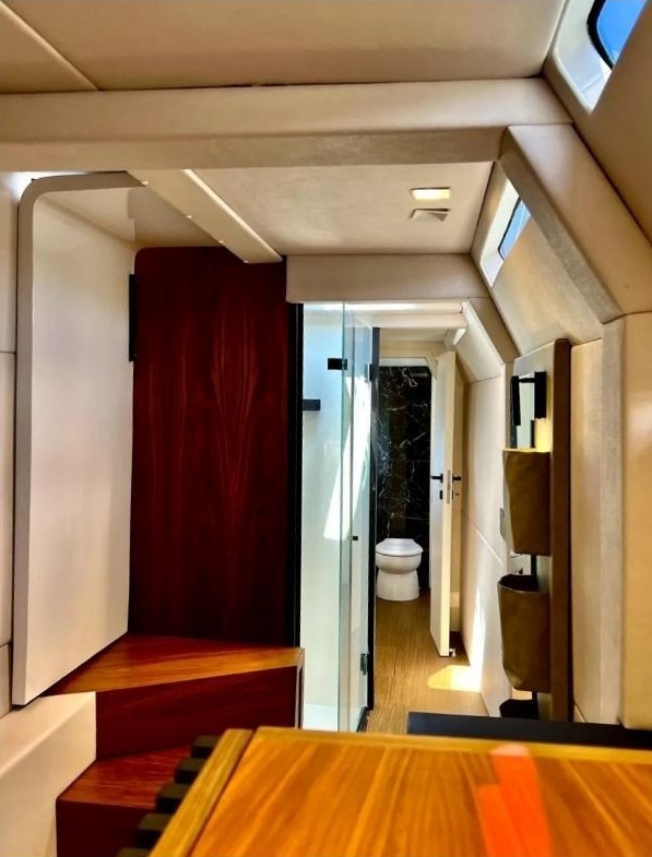Stoga je važno napomenuti da je plovilo Mirakul u ovoj kategoriji jedno od rijetkih koje je objedinilo prostorno sunčalište i garažu za pomoćni čamac. Dodatne opcije su finese poput integrirane hidraulične pasarele koja se aktivira jednim pritiskom na daljinski upravljač te izlazi iz posebnog spremišta unutar platforme za kupanje. Dominiraju najkvalitetniji materijali poput bijelog hrasta, brušene kože.