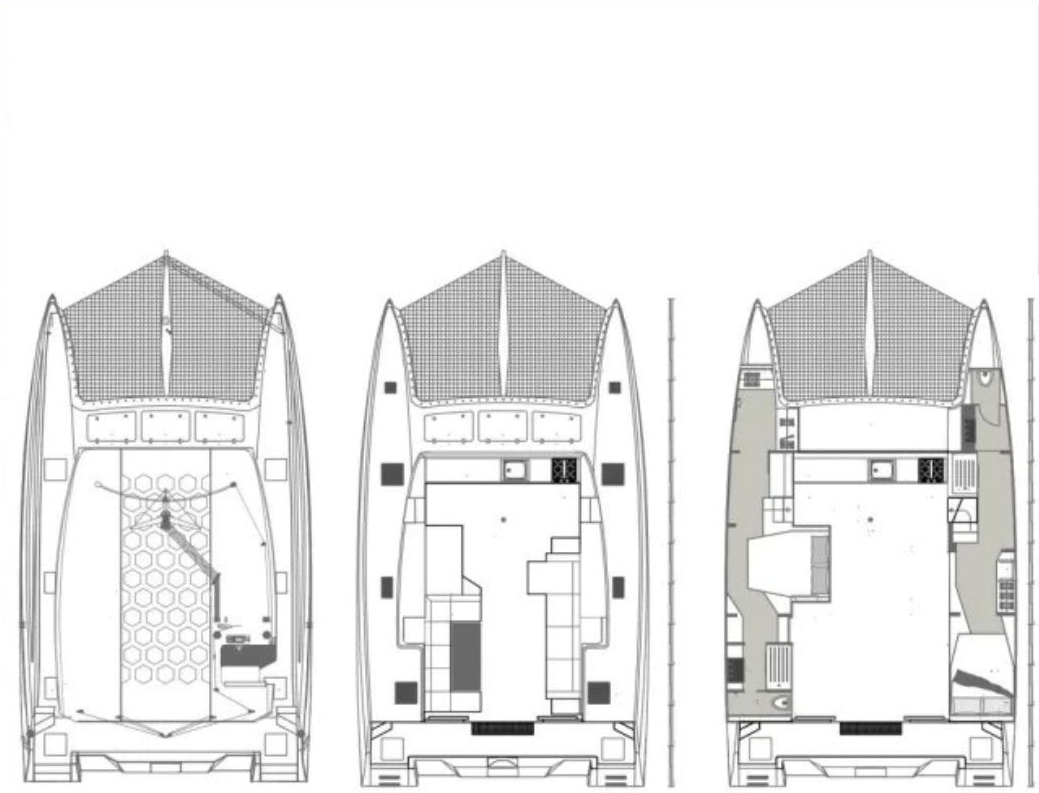 Katamaran se uzdiže visoko iznad vode. Ima pramac u obliku sablje. Trupovi s monolitnim bočnim stranama, odlikuju se samo kontinuiranim ostakljenjem.Palubna kućica ima ostakljene šesterokute.